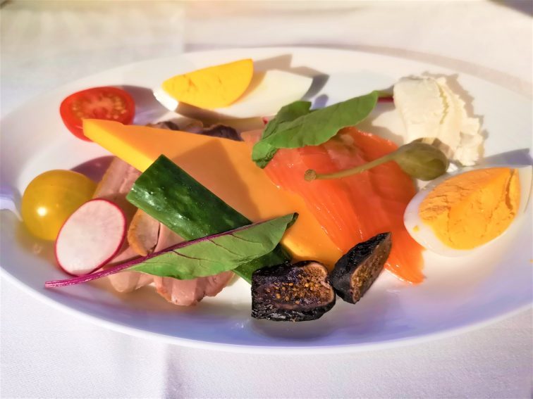冷製プラッター。朝食ですが、ディナーの前菜なみの豪華さ。もちろんシャンパンを頼んで朝シャンもできます。