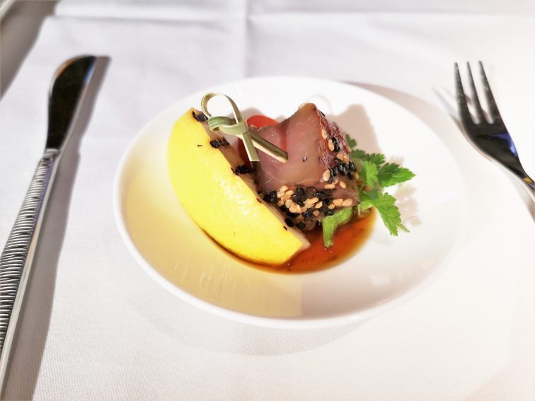 QR807は無事に定刻通り離陸。 離陸1時間後にお待ちかねの食事のサーブが始まりました。ますは「美味しいスナックリスト」にあった「セサミツナ」。マグロはミディアムレアにグリルされ、ゴマの風味がとても香ばしい逸品です!