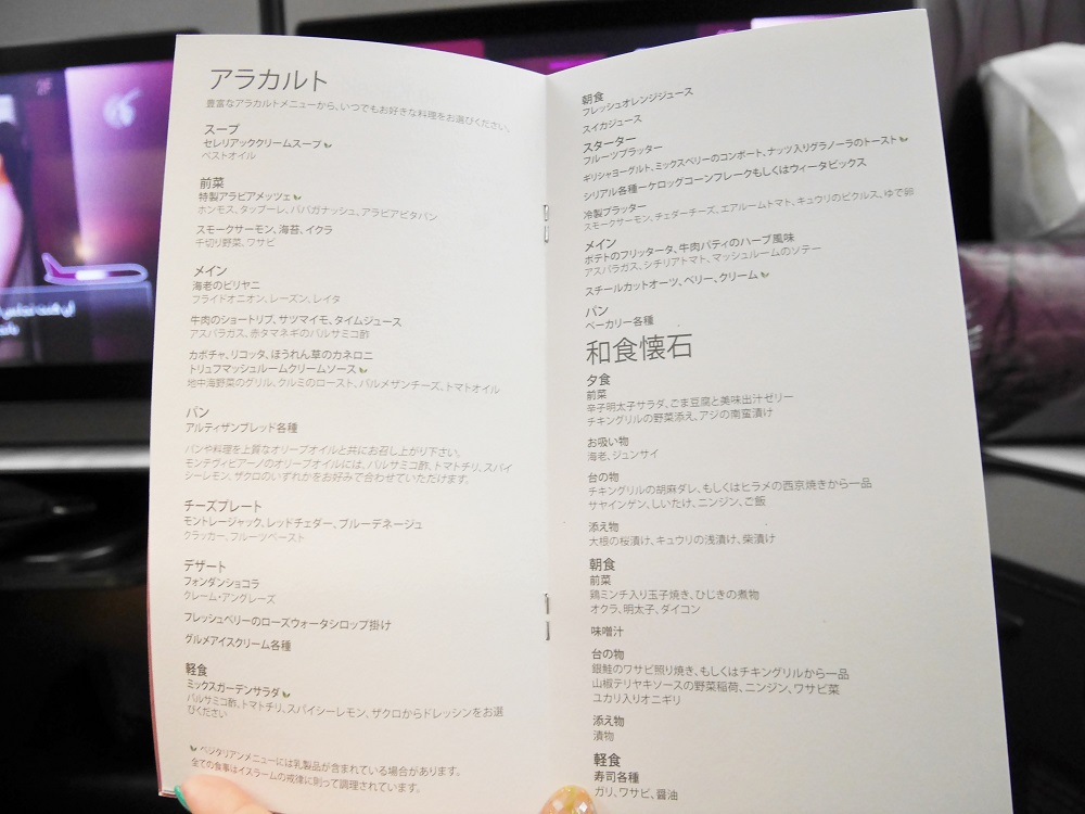 Qスイートの食事は前菜、メイン、デザートと、すべてアラカルトメニューの中から好きなものが選択可能。日本食、中東食、洋食があり、前菜、メイン、デザートを全部ジャンルを変えても楽しそう。搭乗後「メニューはいかがいたしましょう?」「いつ頃サーブしましょうか?」と、丁寧に尋ねられます。