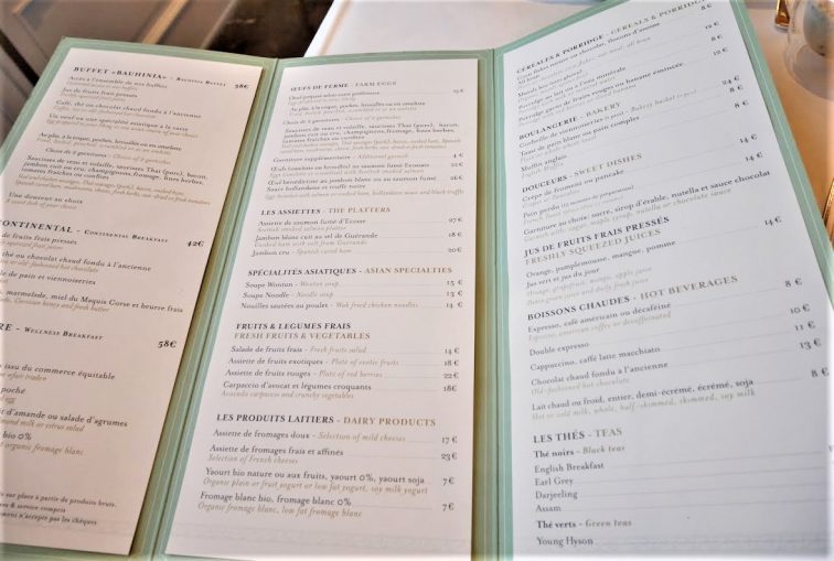 今回紹介する朝食メニューも、通常と「シャングリ・ラ ホテル パリ」とは異なるものになりました。通常はコンチネンタルブレックファスト、アメリカンブレックファスト、そしてさすが香港資本らしい中華の3パターンから朝食をチョイスするシステムだそうですが、私たちは通常の「ラ・バウヒニア」のビュッフェに加え、アラカルトで他の物も注文できるというブレックファスト。同じ時期に宿泊された方は同じ感動を味わっているのではないでしょうか?