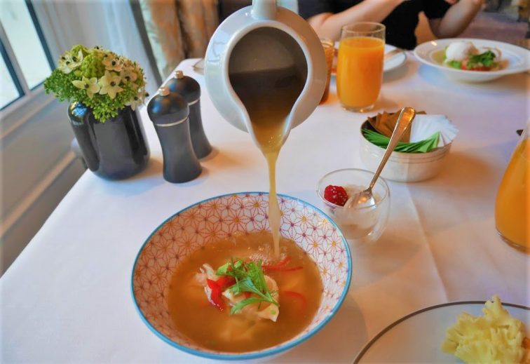 香港に本社を置くシャングリ・ラだけに、パリの「パラス」という位置づけにありながら、本拠地の良さもおもてなしに取り入れています。そのため、アラカルトには中華料理もあります。シャングリ・ラ ホテルを利用したことのある人にはお馴染みの「シャンプレイス(Shang Palace)」は欧州初のミシュラン1つ星中華ダイニングに輝きました。そんな経緯もあり、中華風のお粥をオーダーしましたが、さすがは「シャングリ・ラ ホテル パリ」。提供方法もエンターテインメント性たっぷりです。