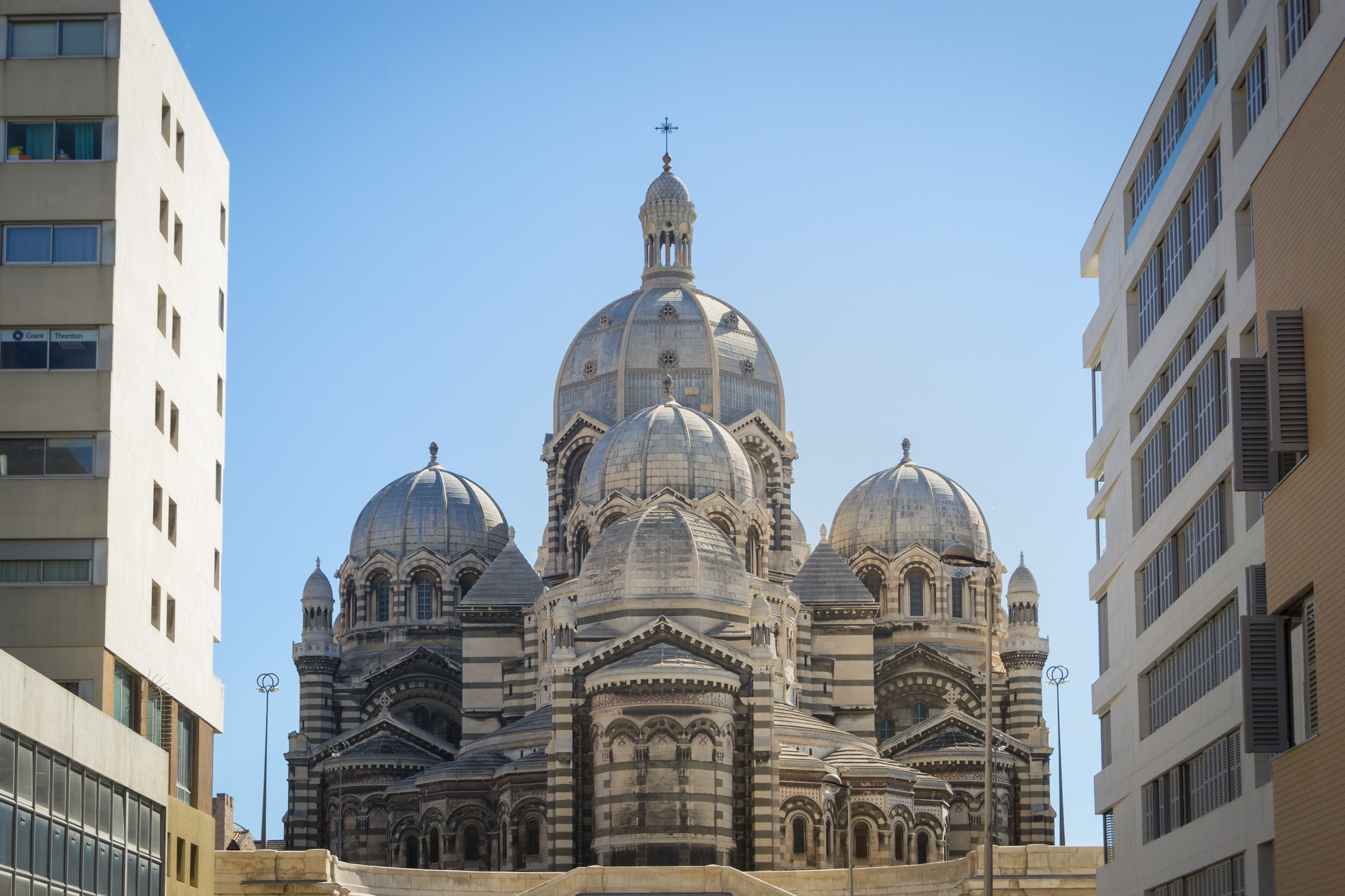 イフ島から旧港に船で戻ったら、マルセイユ大聖堂へ。建物を目印に歩けばアクセスも簡単。クルーズ船で来る方は、まるで海上に浮かんでいるような佇まいに驚いてしまうことでしょう。