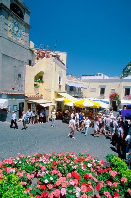 カプリ島は、北イタリアのコモ湖と並ぶ、イタリア2大リゾートに数えられ、多くのイタリア人が別荘を持つ場所。夏はイタリア人バカンス客と、イタリア以外のヨーロッパからやって来るバカンス客で、東京の千代田区程度しかない広さのカプリ島の人口が一挙に増え、賑やかになります。
