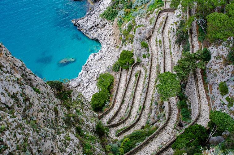 庭園から海に続くループ式の小路「ビア・クルップ」は上から見下ろすだけでも衝撃の美しさ!1900年頃にドイツの実業家アルフレッド・クルップが手掛けたもので、地中海に面する断崖絶壁の岩を削り作られています。棚田を見て「美しい」と感じる感情と似たような感覚に陥りますね!