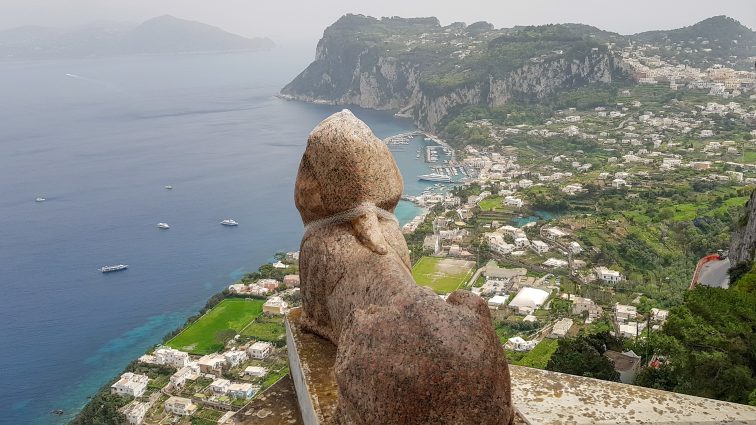 美術館を見終わったら、庭の東屋に近いテラスへ。さすが皇帝の別荘地だけに、カプリ島の素晴らしい光景をわがものにしたような眺望です。御影石のスフィンクスを入れて撮影するのが、ここでの定番です。マリーナグランデを行き来するフェリー、ベスキオ山などを堪能しましょう。