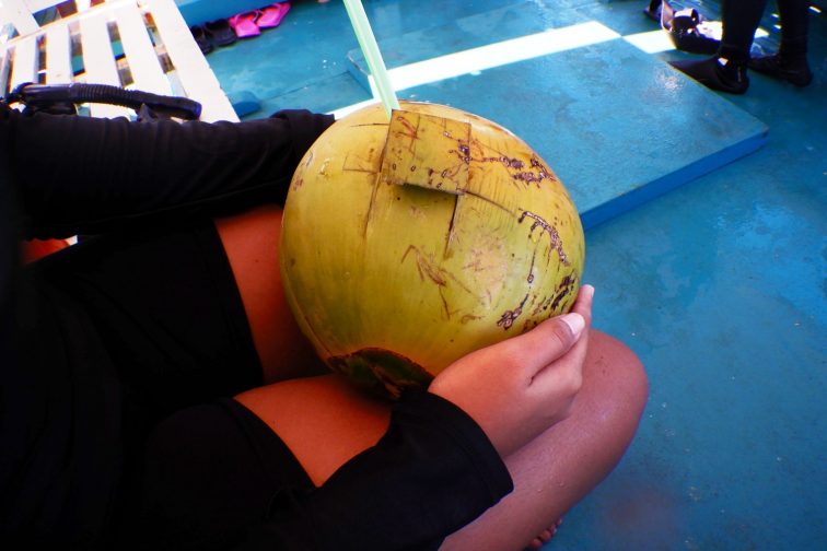 ボートの上でココナッツジュースを飲む♪
