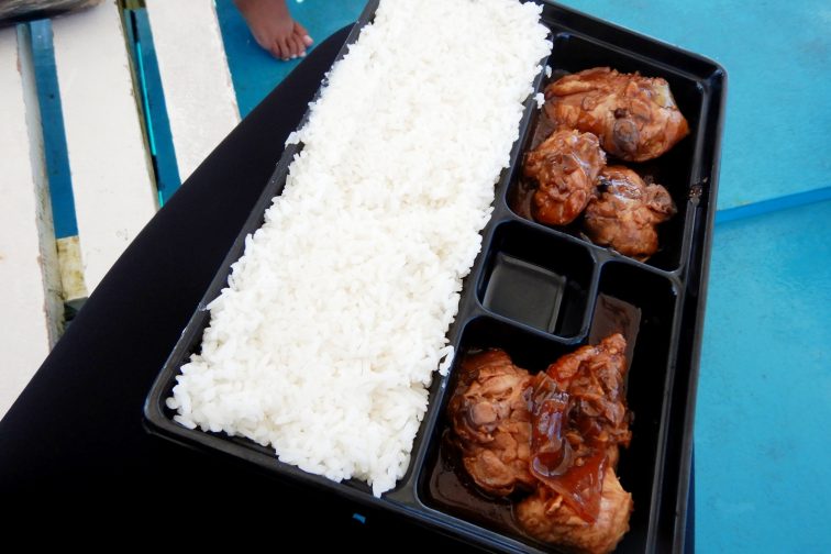 ジュゴンのあとは別のシュノーケリングスポットに停留し、少しだけ潜ってからランチタイム。昼食は前日にホテルで頼んでおいたお弁当です。ディナーメニューの最後のページに「ツアー用」のメニューが記載されています。ランチ代はチェックアウトの際にまとめて清算するので、ツアー中の支払いはありません。