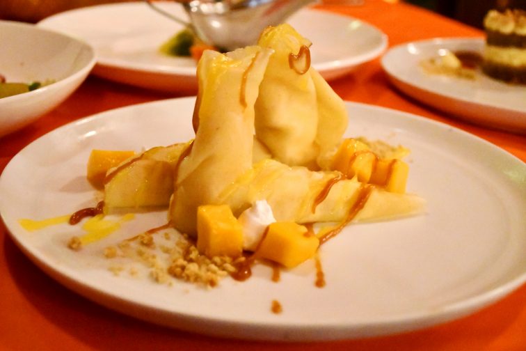 飲み物はお店イチオシの「ブスアンガマンゴー(250ペソ≒540円)」をオーダーしました。さらにデザートでティラミスとマンゴークレープをいただきましたが、お腹いっぱいで全部は食べられず。ふた口ほど食べてお持ち帰りボックスに入れてもらいました。