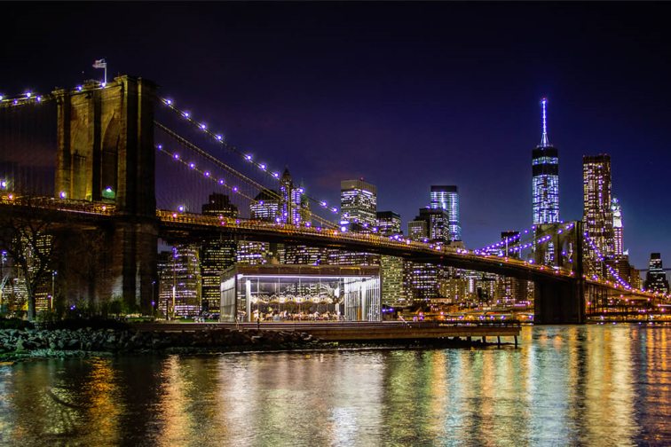 そんなダンボ地区からは、キラキラとライトアップされたブルックリンブリッジとマンハッタンブリッジ、そしてイースト川越しに見えるニューヨーク摩天楼の美しいイルミネーションを楽しむことができます。なかでも、ひときわ高く見えるのは、2001年9月11日の同時多発テロの跡地に造られたワン・ワールド・トレード・センター。とてもスタイリッシュで印象的なビルです。ときおり川を通るフェリーの灯りもその夜景のきらびやかさに華を添えています。