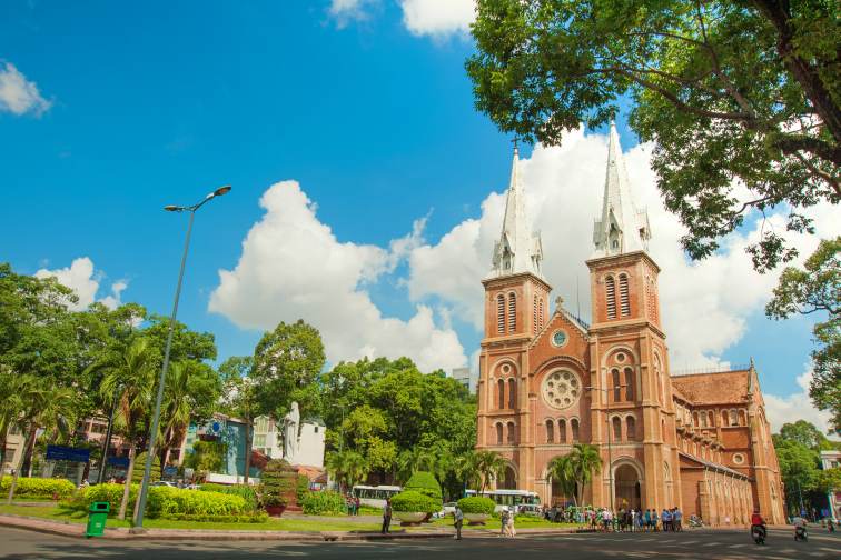 ホーチミン人民委員会庁舎から徒歩6分のところにある「サイゴン大教会」。60mもある大きな尖塔が特徴的で、フランスから運ばれたレンガで造られている、ネオゴシックスタイルの立派なたたずまいに感動します。ベトナム人のブライダルフォトスポットとしても有名で、毎日のように教会前で撮影している人たちがいますよ。