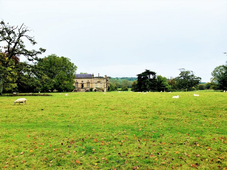 敷地内には牧場があり多くの羊が飼われています。もこもこしてかわいいですね~。奥に見えるのは修道院の建物。庭園も美しく、中世に造られたオブジェや門に、英国の歴史を感じさせられます。