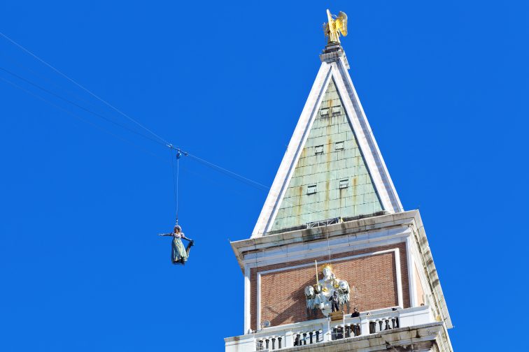 ベネチア在住の若い女性の中から選ばれた12人がベネチアの町をパレードする「マリアたちの行進」。そしてその中から一人の女性が選ばれ、98.6mもある鐘楼から、天使のコスプレをしてサンマルコ広場に舞い降ります。べネチアの女性にとっては、この1名に選ばれ宙を舞うことは大変名誉なことなのだそう。