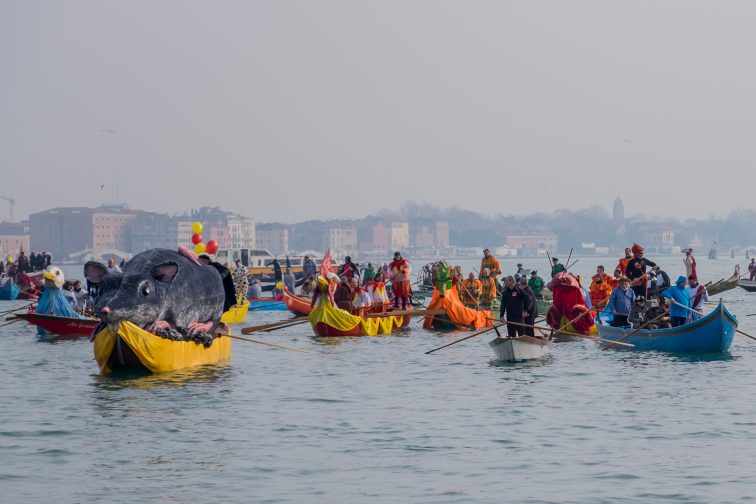 例年オープニングセレモニー翌日の日曜日に行われる大きなイベントが水上パレード。14世紀から17世紀までに20回以上ベネチアを襲ったペストを現わしているのでしょう。ネズミの扮装をした人や、リアルなネズミの装飾をした船が目立ちます。