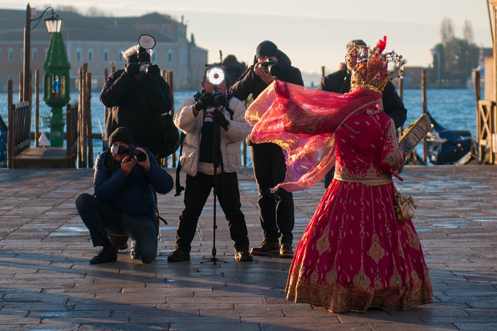 ベネチア・カーニバルに、わざわざ衣装を持参してベネチアで着替え、お披露目するマスケラたちは、その華麗な姿を多くの人に撮影してもらいたい人ばかり。ベネチア共和国時代に戻ったかのようなこの光景は1年で1度しか撮影できない光景でもあります。