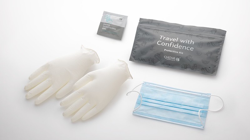 搭乗後は、使い捨てマスク、使い捨て手袋、消毒ジェルの入ったプロテクトキットを乗客全員に配布してくれます。