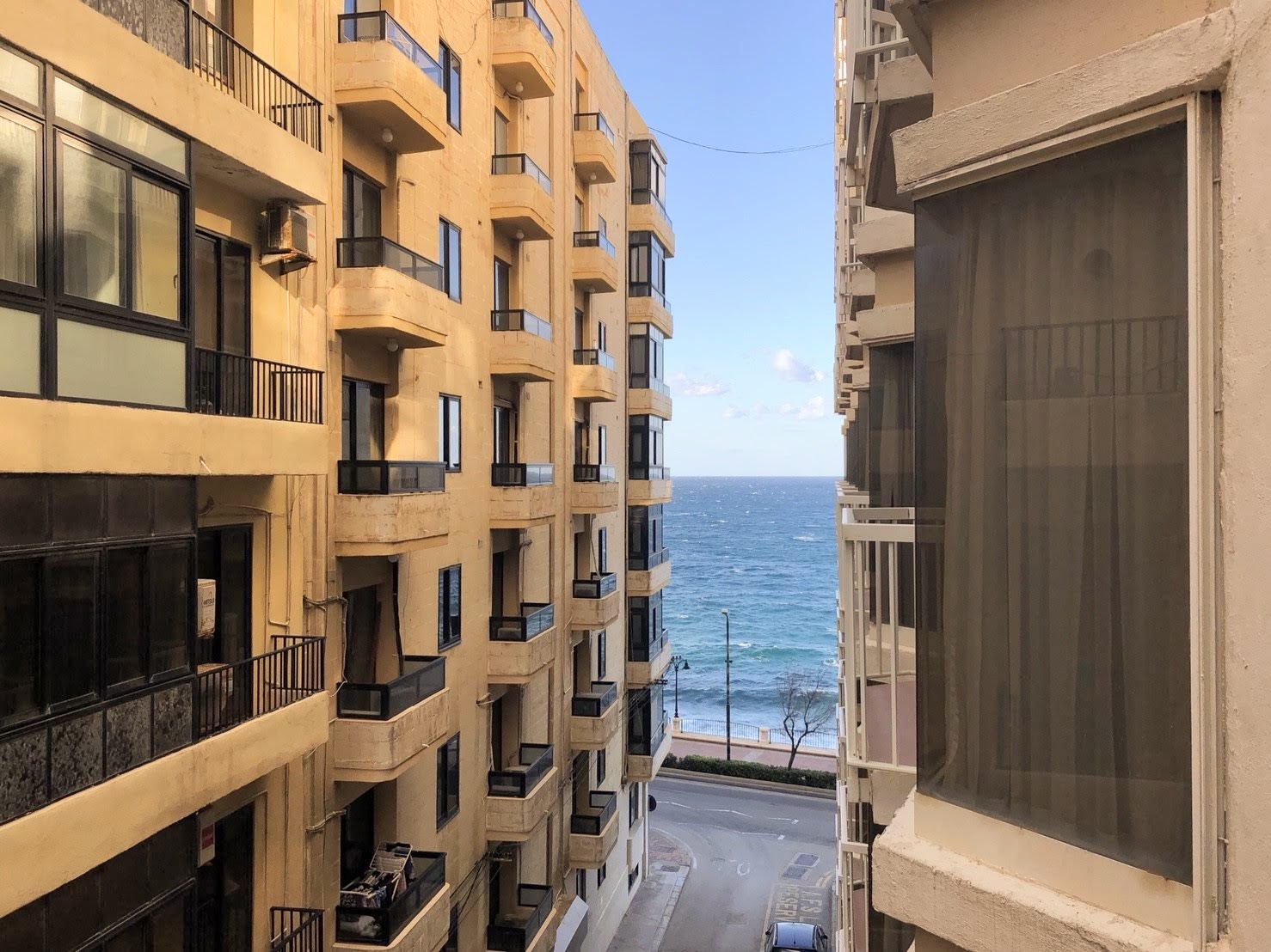 比較的リーズナブルな4つ星ホテルで内装はシンプルです。立地はスリーマ地区の海沿いの道タワーロードに面しており、ホテルの目の前は地中海!