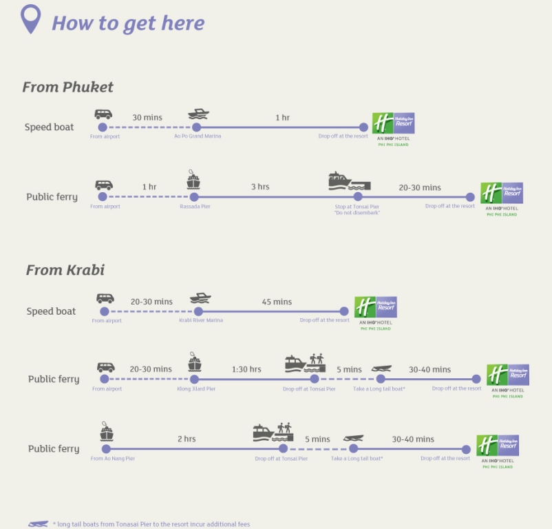 ピピ島北東端に位置し、プーケットからホテル専用スピードボートで約1時間もしくは、クラビから公共フェリーに乗って約3時間で到着します。送迎希望の場合は事前にホテルへリクエストを入れる必要があります。ご自身で手配の際は下の図を参考にしてみましょう!当社のツアーでしたら、面倒な手配は一切なく、専門スタッフにおまかせできるので安心!