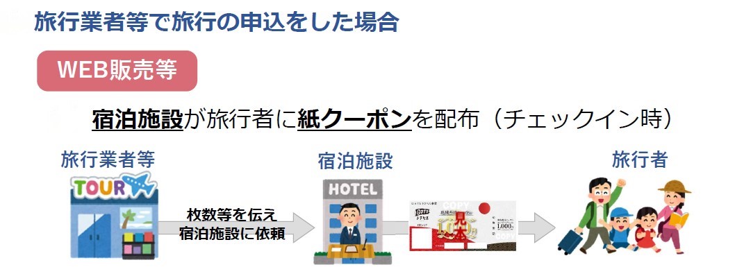 旅行会社のWEB通販で予約・購入した場合、旅行会社によって紙クーポンか、後で紹介する電子クーポンか異なります。紙クーポンの場合、宿泊施設のチェックイン時に受け取ることが多いですが、稀に、旅行を予約・購入した代表者に事前に送られる場合もあるようなので、予約・購入時に確認しておきましょう。