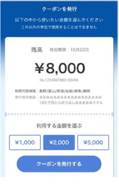 クーポンを受領すると、マイページでクーポンの残高が表示されます。使いたい場合は1,000円単位で1,000〜5,000円まで5種類の中から発券したい金額の券種を選択し、発行する、をプッシュ。