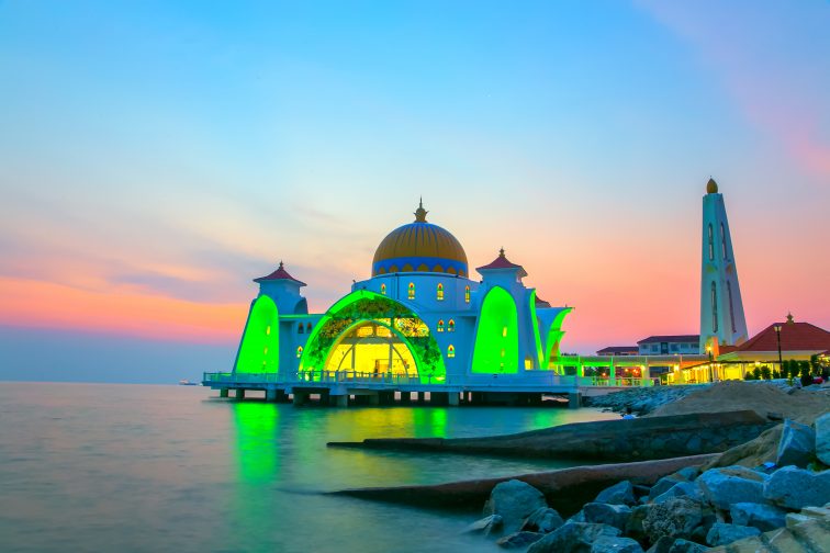 マラッカにある水上モスク「マラッカストレイツモスク(Melaka Straits Mosque)」。