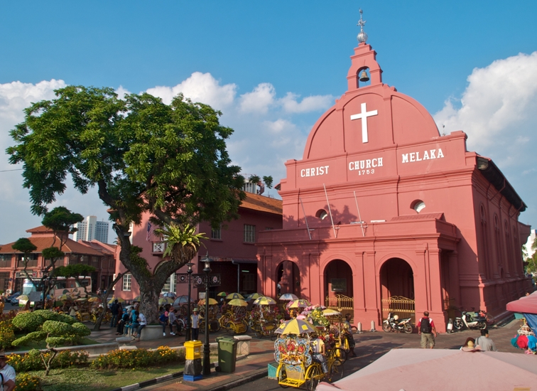マラッカの象徴、コーラルピンクの建物が並ぶオランダ広場には、1753年に建てられた「マラッカキリスト教会」、旧オランダ総督邸で現在はマラッカの歴史博物館である「スタダイズ」など、ヨーロッパ統治時代の色が残る町並みです。