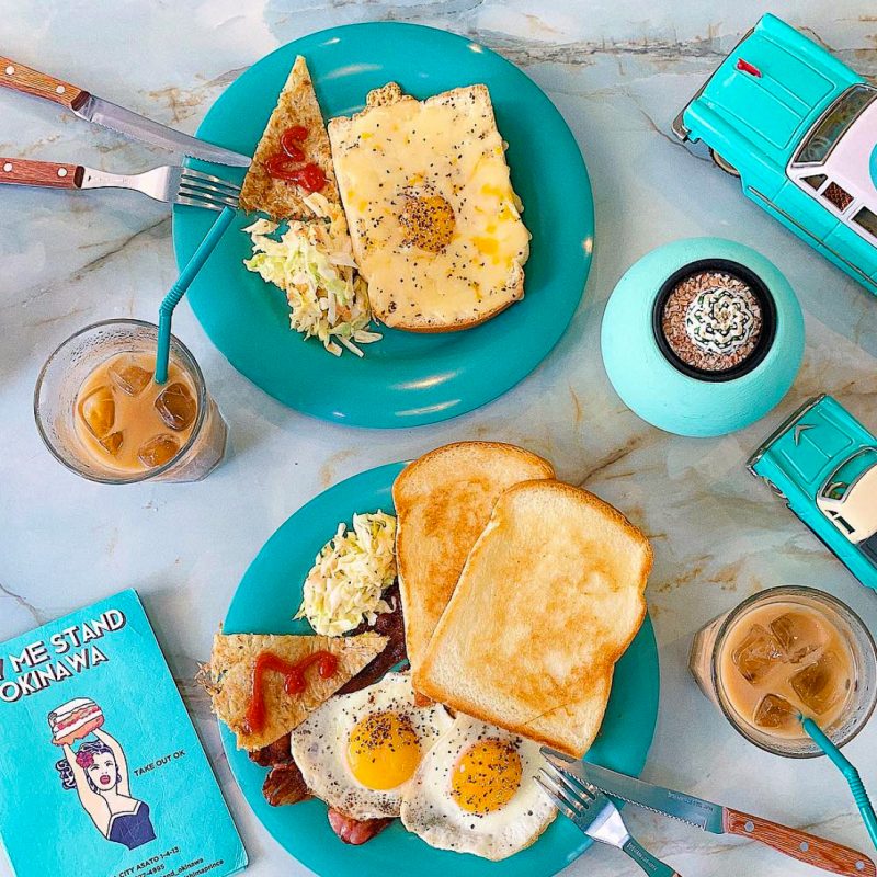 「那覇市内 可愛いカフェ」の検索で必ず上位にランクインしているのが<BUY ME STAND OKINAWA(バイミースタンド 沖縄)>。SNSでミントグリーンのプレートや店内の写真を見かけた方も多いのでは?ひとまずここに来たら、壁に飾られたネオンライト(映えの代名詞!)の前にあるバーチェアに座って友達と記念の1枚を♪メインのグリルサンドとあわせて日替わりスープも注文できます。