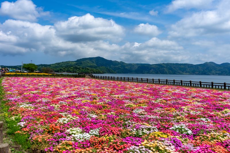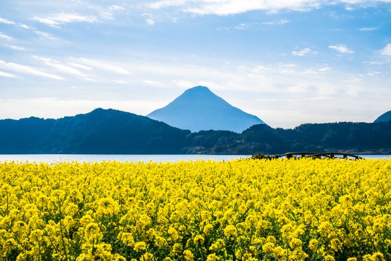 池田湖は九州最大のカルデラ湖で、指宿市の天然記念物に指定されています。大うなぎの生息地として知られており、イッシーという幻の怪獣が住むとも言われています。湖の周りには植物が栽培され、季節によって色とりどりの花を咲かせます。湖の先には開聞岳がそびえ、青い湖と雄大な山の美しい景色が堪能できます。観光の合間にのんびり散策するのもおすすめです。