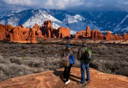 アーチーズ国立公園は砂漠地帯に位置するため夏は非常に暑く、冬はかなりの寒さとなります。園内は、日陰のない乾燥地帯で、特に夏は軽く40℃以上に。1人3リットルの水を持っていっても多過ぎません。途中で水は手に入らないので、十分過ぎるくらいに持って行くことをおすすめします。また、日差しが強いので日焼け止め、UVカットの上着、帽子、サングラスなど日焼け対策は万全にしましょう。一方、冬はトレイルが凍結します。簡易アイゼンやチェーンスパイクなど十分な装備があると非常に安心です。