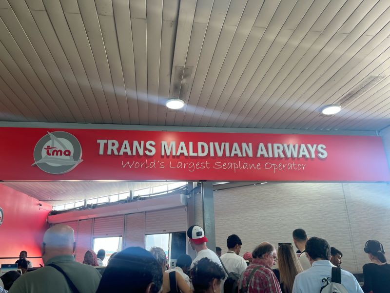空港からは水上飛行機での移動となります。今回はモルディブの水上飛行機の会社の中で、TMA(トランス モルディビアン エアウェイズ)を利用しました。マレ空港内にあるTMAのカウンターで、チェックインを行います。水上飛行機には荷物の重量制限があり、おひとり様あたりスーツケース+手荷物の合計が25kgまで!チェックイン時に手荷物のサイズを測ります。チケットを受け取ったらマレ空港から水上飛行機の乗り場まで、車で約10分ほど移動します。