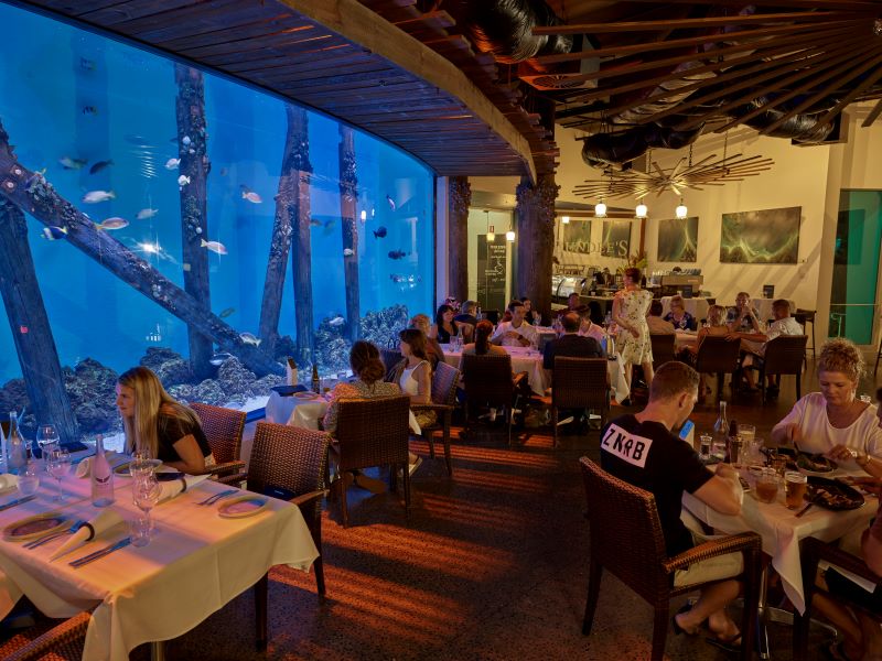 大きな水槽で泳ぐ魚たちを眺められる、ケアンズ水族館に併設されるレストラン。お食事をしながら魚たちを眺められる癒しの空間です。