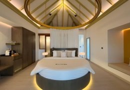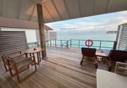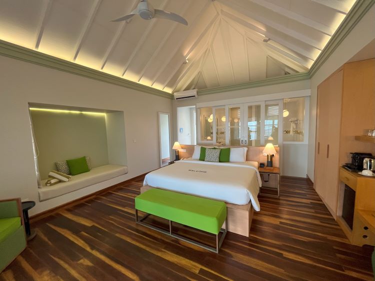 今回は真ん中の”ドリームアイランド”に位置する「グランド水上ヴィラ」に宿泊しました!メインアイランドのジェッティ(船着き場)に到着したので、バギーに乗って橋を渡り、隣のドリームアイランドまで移動します。広々としたベッドルームを挟んで、テラスとバスルームに分かれています。高い天井とシーリングファンが印象的で、ベッドから見える海も含めて解放感がすごい!海を挟んで隣の”ロマンスアイランド”の水上ヴィラが遠くに見えるのもモルディブらしくて素敵でした。