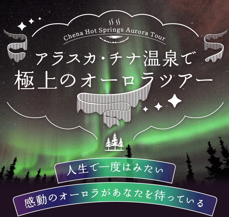 チナ温泉へ行くツアーアラスカ内陸部に位置するチナ温泉は、オーロラベルトの真下にある世界有数の観測地として知られています。乾燥した内陸性気候と晴天率の高さにより、年間を通じて高い確率でオーロラ観賞が可能です。チナ温泉郊外には、静かな環境に佇むオーロラ観賞専用のロッジが複数点在。暖かい飲み物を片手に、快適な屋内施設から夜空に広がる幻想的な光のカーテンをゆったりとご鑑賞いただけます。街明かりの届かない漆黒の空に舞うオーロラは、まさにアラスカならではの自然の奇跡。一生に一度は見たい絶景を、ぜひチナ温泉でご体感ください。