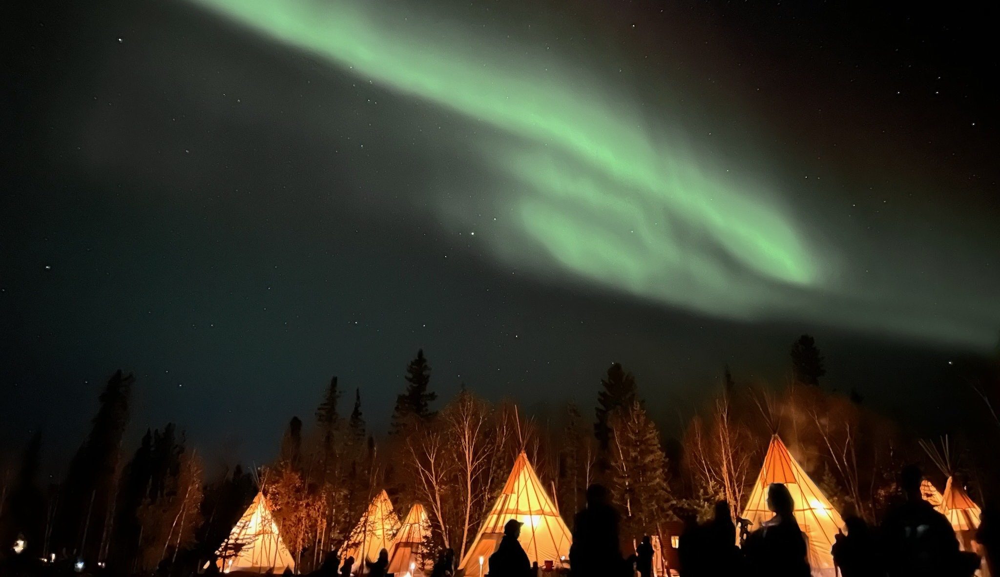 ティーピー(カナダ北部の先住民が使う移動式テント)では、温かい飲み物を楽しみながら暖を取り、休息をしつつ、美しいオーロラの現れる瞬間を待つことができます。