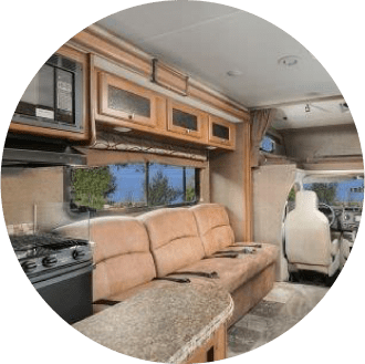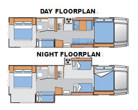【設備】エアコン、暖房機、発電機、シャワー、水洗トイレ、温水装置、シンク、ガスレンジ、電子レンジ、オーブン、大型冷蔵庫、清水タンク(155 リットル)、排水タンク(グレー=113 リットル、ブラック=147 リットル)、ガソリンタンク(208 リットル)、プロパンガス(68 リットル)