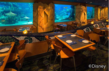 巨大な水槽に魚たちが泳ぐ、まるで海の中のような神秘的なレストランです。シーフード料理だけでなく、ステーキやキッズメニューも豊富。