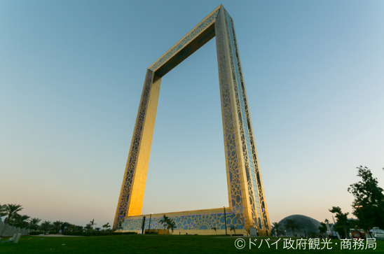 2018年1月にオープンしたばかりの「ドバイフレーム」。片側からは旧市街、逆側からは近未来都市部が見えます。高さ150mの上部は展望台、内部ではドバイの未来が見える!?