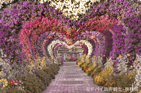 ナチュラルな庭園で世界最大を誇る「ミラクルガーデン」。何千種類もの色とりどりのお花が様々な造形で見る者を魅了します。ハート型のアーチはインスタ映え抜群です!