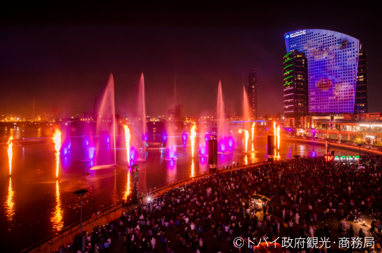 運河に面したショッピングモール「フェスティバル・シティ」では、ドバイ・ファウンテンを超える噴水ショーを観賞可能!プロジェクターで水に映し出される映像は感動の美しさ。