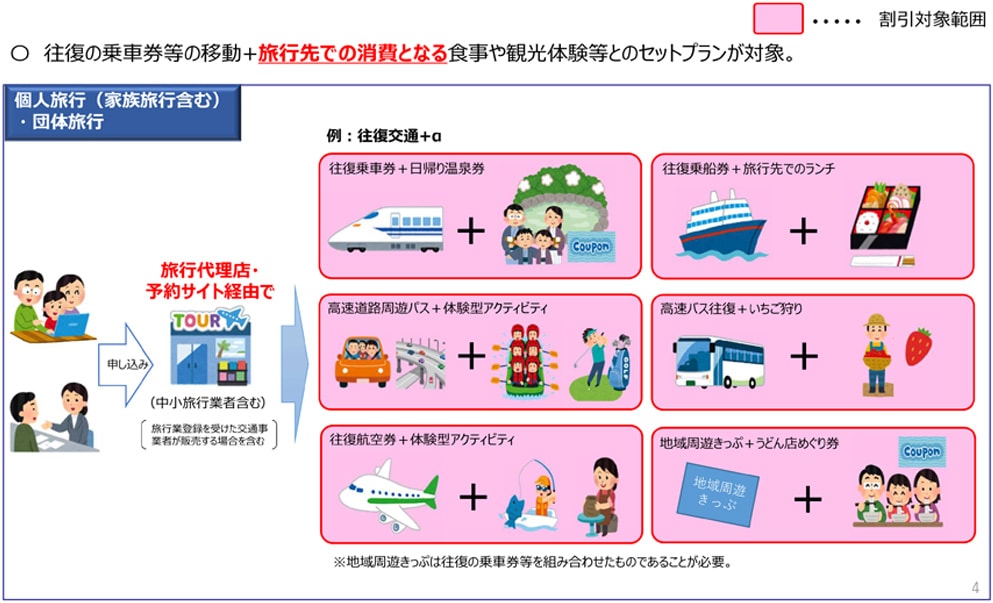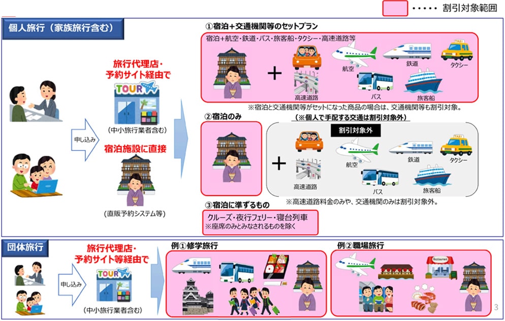 旅行代理店やオンライン予約サイト、直接宿泊施設へ予約する宿泊が対象となります。また、旅行会社が企画した交通(飛行機・鉄道・バス・高速道路など)と宿泊がセットになった旅行商品(社員旅行や修学旅行などの団体旅行も含む)、日帰り旅行も割引対象です。