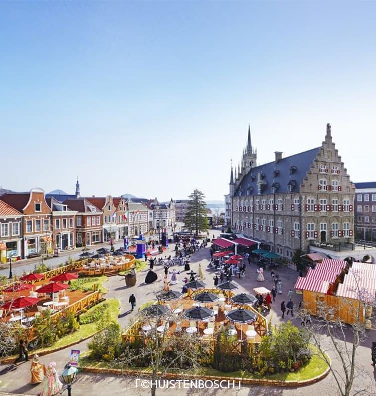 高さ105mのシンボルタワー「ドムトールン」からはハウステンボス全体を一望できます。タワーのふもとにはおいしいグルメが集結してます。