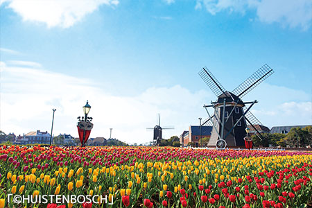 三連風車がシンボルの代表的なビュースポット。一面に咲くチューリップや日本最長85mの音楽に合わせた光の噴水ショーは圧巻!