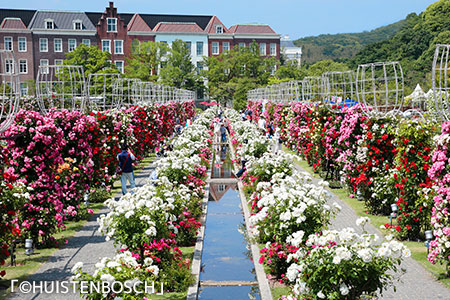 ハウステンボス最大のガーデンエリア。圧倒的な美しさを誇る初夏のバラは必見!夜空から広大なアートガーデンへと流れ落ちる幅66mの光の滝は壮観。