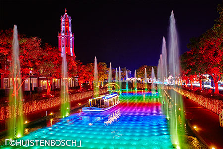 全長6kmの運河を運航しており、 船上からの田園風景や街並みは格別!日没後は、イルミネーションに彩られた運河で光と噴水のショーが始まります。