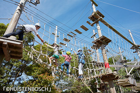 丘の上から運河を越えて、全長300mを一気に滑り降りるジップラインや最高9mの高さに張り巡らされた空中アスレチック「天空の城」などスリル満点!