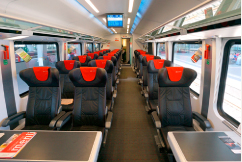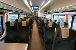 広々とした1列+2列の座席配列。ほどよい硬さのリクライニングシートで、各座席に電源コンセント付。英語やドイツ語などの新聞・雑誌の無料サービスあり。車内販売やビュッフェ車両にて食事・ドリンクを購入できます。Quiet Zone(静かな座席)あり。