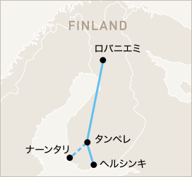 サンタクロースの故郷として知られる北極圏ラップランドの州都ロバニエミと、フィンランドの首都ヘルシンキを結ぶ「サンタクロース・エクスプレス」。めずらしい寝台列車(夜行列車)に乗車し、冬はオーロラ、夏は白夜体験へ。飲み物やサンドイッチの軽食をはじめ、スープやミートボールなど温かい食事を楽しみながら北極圏へむかいましょう。タンペレにはムーミン谷博物館がありますので、こちらに立ち寄りもおすすめです。