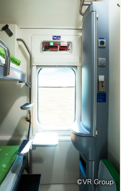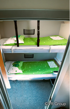 【シングル(1人部屋)/ダブル(2人部屋)】 ◆1階のコンパートメント ◆車両内設置のシャワーとトイレを共用利用 ◆鏡付き洗面台 ◆ドライヤーやシェーバー用のコンセント ◆石鹸、ミネラルウォーター、タオルなどのアメニティー ◆各ベッドにマルチ機能パネル(照明、コンセント、目覚まし時計、ラジオが一体) ◆簡易式のテーブルと椅子 ◆エアコン ◆オートロック(カードキー)