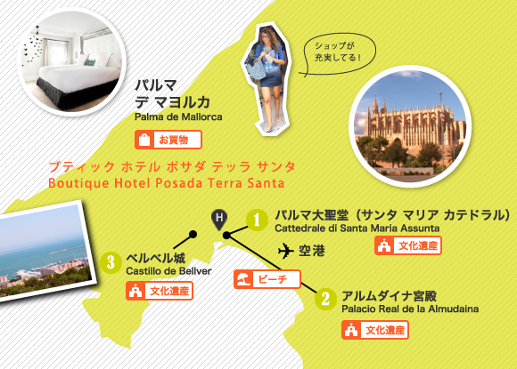 パルマ大聖堂から歩いてすぐの好立地にあるブティック ホテル ポサダ テッラ サンタ。徒歩圏内にレストランやショップが多数ありますので、滞在や観光の拠点として最適です。16世紀の邸宅を改造し、ヨーロピアンでありながらエキゾチックな雰囲気に仕上げています。ブティックホテルという名にふさわしい、隅々までこだわったインテリア、アメニティが乙女心をくすぐります。