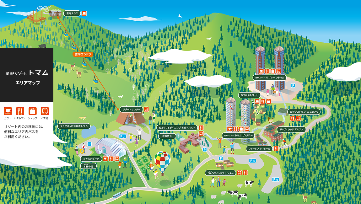 エリア内ホテルのトマム ザ・タワーかリゾナーレ トマムより、リゾートセンター(雲海ゴンドラ山麓駅)まで、エリア内バスを利用できます。