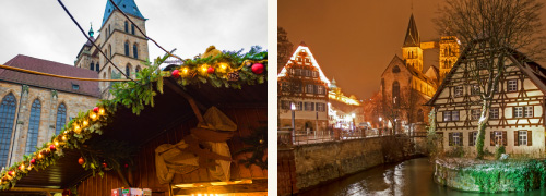 シュトゥットガルトの南東にある「エスリンゲン」は、ドイツ最古と言われる美しい木組みの家々が並ぶ、中世の面影を色濃く残す街。クリスマス・マーケットも、屋台やお店の人々が中世の衣装を着ています。中世に迷い込んだかのようなクリスマスを体験できます♪